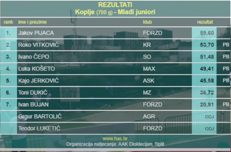 3. místo - dorostenci - 2025 - 700 g - 51,82 m - letní mistrovství Chorvarska